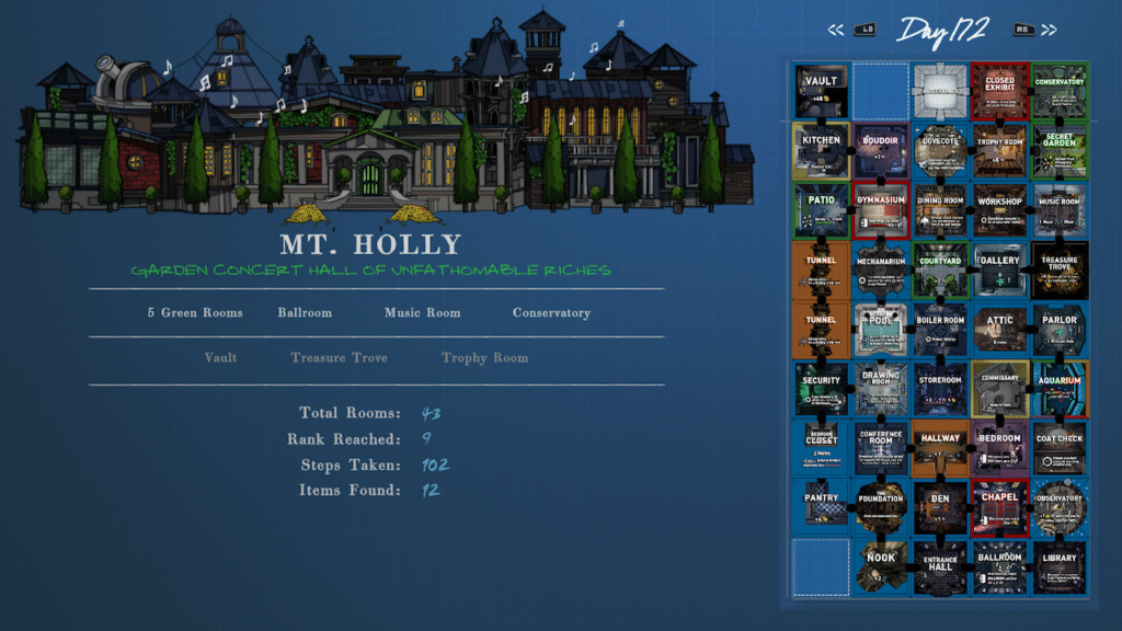 Chaque porte que tu ouvres te propose trois salles possibles. Tu dois choisir laquelle sera placée sur le plan du manoir. Le tout est limité par un nombre de déplacements par journée. Quand t’as plus de “steps”, c’est fini, reset.