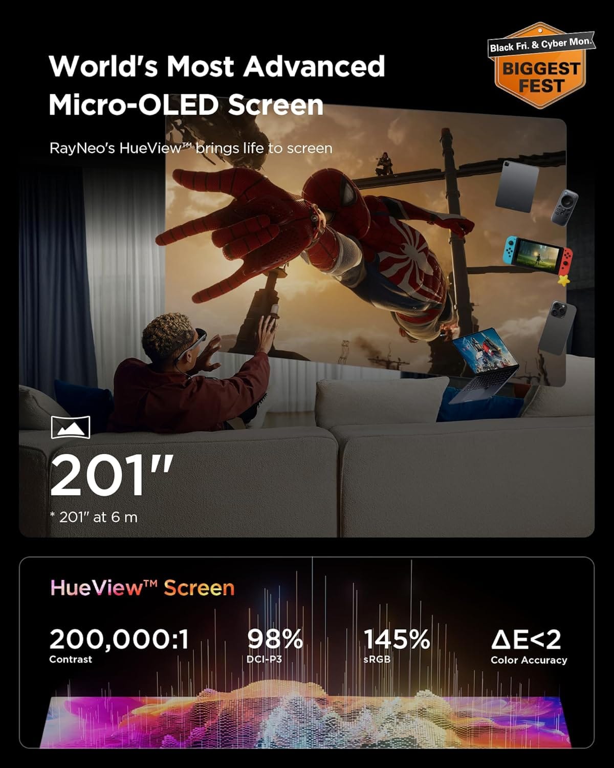 C’est clairement le point fort des RayNeo Air 3S : l’image. Le micro-OLED donne des noirs vraiment profonds, un contraste solide, et un rendu propre qui fait “premium” dès que tu lances un jeu. En gaming, ça reste net et punchy tu sens que c’est fait pour que ça claque, pas juste pour dépanner. Même si ce n’est pas “de la 4K dans tes yeux”, le résultat est vraiment satisfaisant pour du portable, surtout quand tu compares au genre de compromis qu’on accepte habituellement sur des setups nomades.